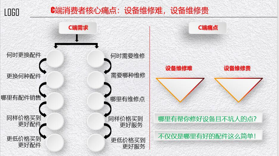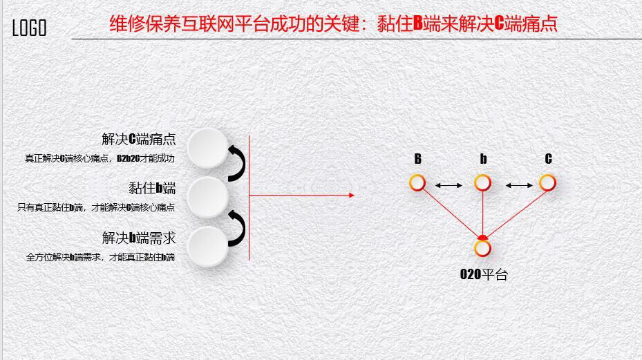 互聯(lián)網(wǎng)平臺怎樣才能夠有可能成功?就是必須拎住B(中間商)端,來解決C端的痛點,互聯(lián)網(wǎng)平臺才能真正成功。知道真正的B端,才能解決C端的需求,全方位解決b端的需求,那才是B2B,也就是說粘住B端來解決C端痛點。C端的痛點是什么?第一是配件,第二是維修。每個維修企業(yè)的毛利率希望往上漲,同時希望我們的費用率越來越低,將企業(yè)的毛利率和費用率進行疏導,才能更好地獲得收益。