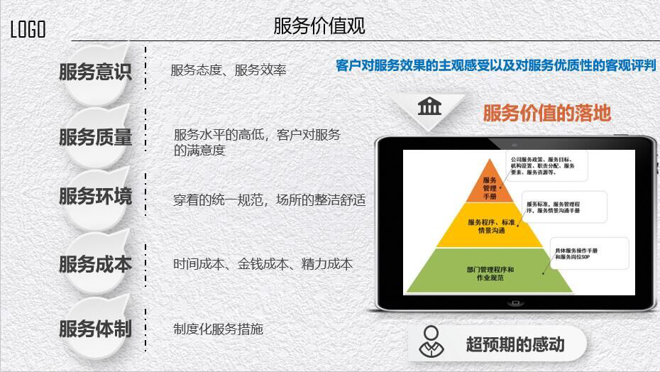 第一,理念是一種模式,技術(shù)服務型的企業(yè)是把企業(yè)文化定位為用戶為中心,圍繞用戶進行發(fā)散和增值服務。服務理念是一個模型,整個團隊首先要有一個同樣的理念,實現(xiàn)團隊作戰(zhàn)。