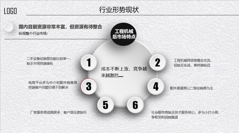 首先是現(xiàn)狀。國內(nèi)資源非常豐富,我們要將這些資源進行整合。1)從二手設備經(jīng)銷商來說,現(xiàn)在的工人和終端客戶的交流相對較少,缺乏市場終端的機會,不懂客戶真正的需求。2)工程機械信息整合交流缺乏實戰(zhàn),離終端較遠。3)電商平臺多為中介和配件經(jīng)銷商,終端客戶問題仍得不到解決。4)廠家服務商詬病多,客戶信任度缺失。5)配件渠道商及二級經(jīng)銷商為主。6)社會服務商缺乏技術(shù)核心,多為小打小鬧,掙錢了就撤退。