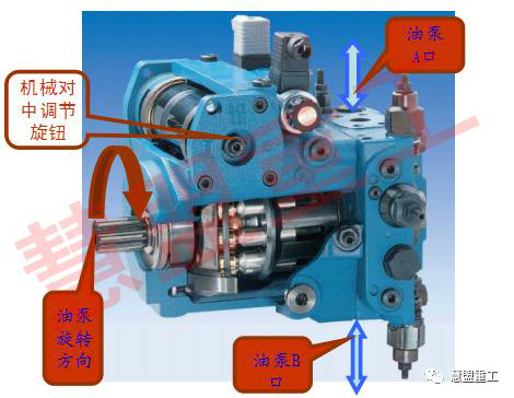 3:當(dāng)如圖泵是順時針轉(zhuǎn)動狀態(tài),且A油口出油,則松開機械對中鎖母,緩緩向外旋動調(diào)節(jié)桿至油缸活塞桿靜止鎖定,再鎖定調(diào)節(jié)桿鎖母;如是B油口出油,則應(yīng)向內(nèi)旋入調(diào)節(jié)桿操作。